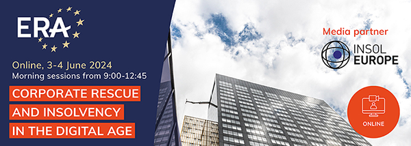 | ERA Online Conference, 3-4 June 2024 - 25% Discount for INSOL Europe Members This year's conference will focus on access to and enforcement of digital assets and the treatment of digital assets as part of the insolvency estate. In addition, there will be a debate on different restructuring schemes in Europe, a report from Brussels on the state of play of new legislative initiatives and a case law review of recent CJEU judgments on cross-border insolvency proceedings. The online event involves many INSOL Europe members, including Stefania Bariatti, Michal Barlowski, Reinhard Dammann, Rita Gismondi, Ilya Kokorin, Antonio Leandro and Irene Lynch Fannon. For further information and to register, visit the ERA website.INSOL Europe members can benefit from a 25% discount using the code 25Insol124D63.
